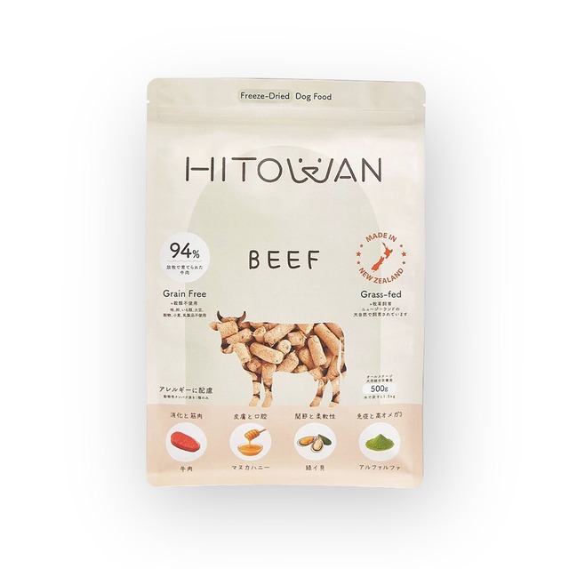 放牧で育てられた牛肉を94%使用した「生食フリーズドライフード」(犬用総合栄養食) 高たんぱく低脂質。 太りやすい子、活動的な中型犬以上にもおすすめ!! ビーフのレシピは動物性タンパク源を1種のみとし、アレルギーが心配な子におすすめです。