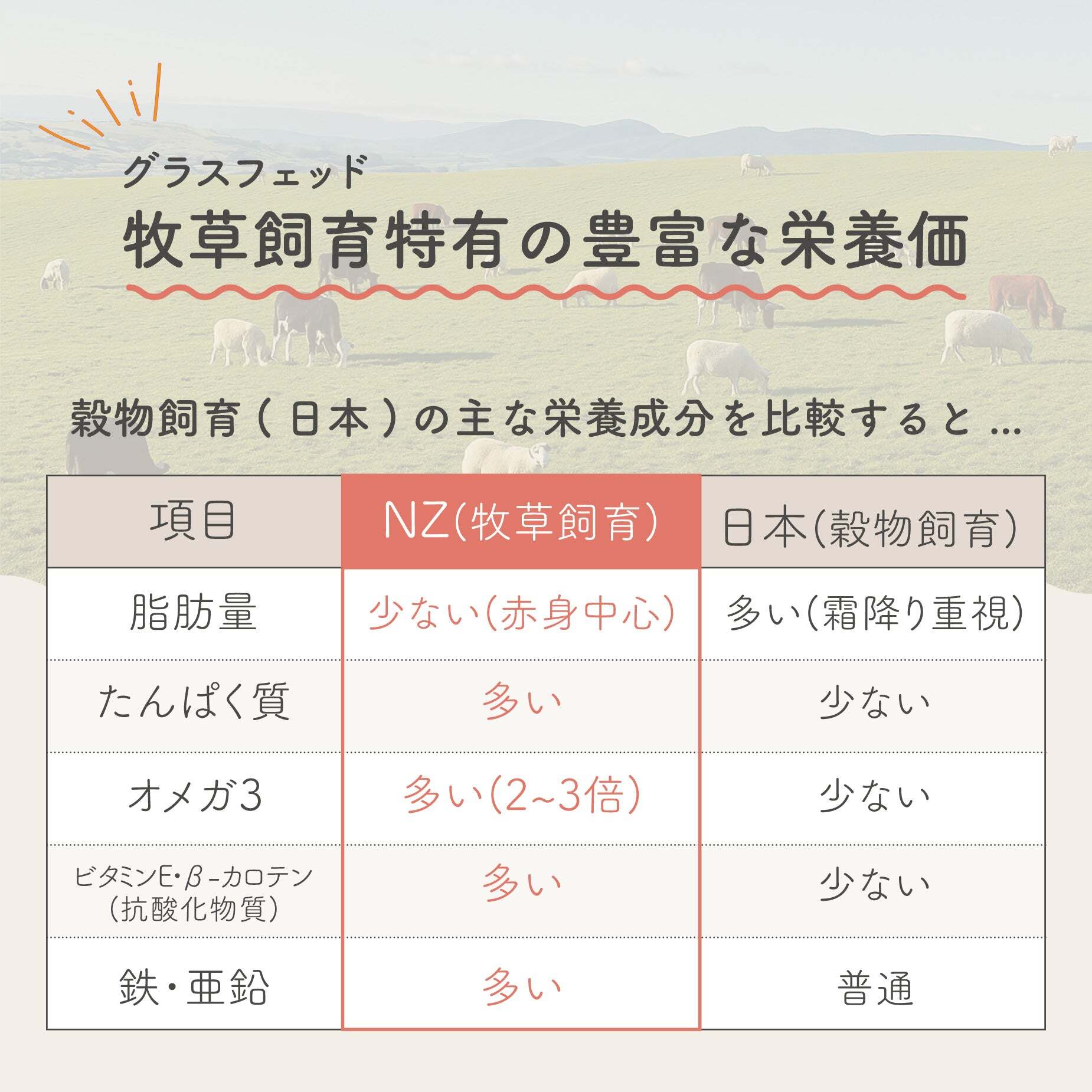 牧草飼育(グラスフェッド)は赤身肉が中心で脂肪が少なく、たんぱく質やオメガ3脂肪酸が豊富です。日本の穀物飼育肉に比べて消化が良くヘルシーです。