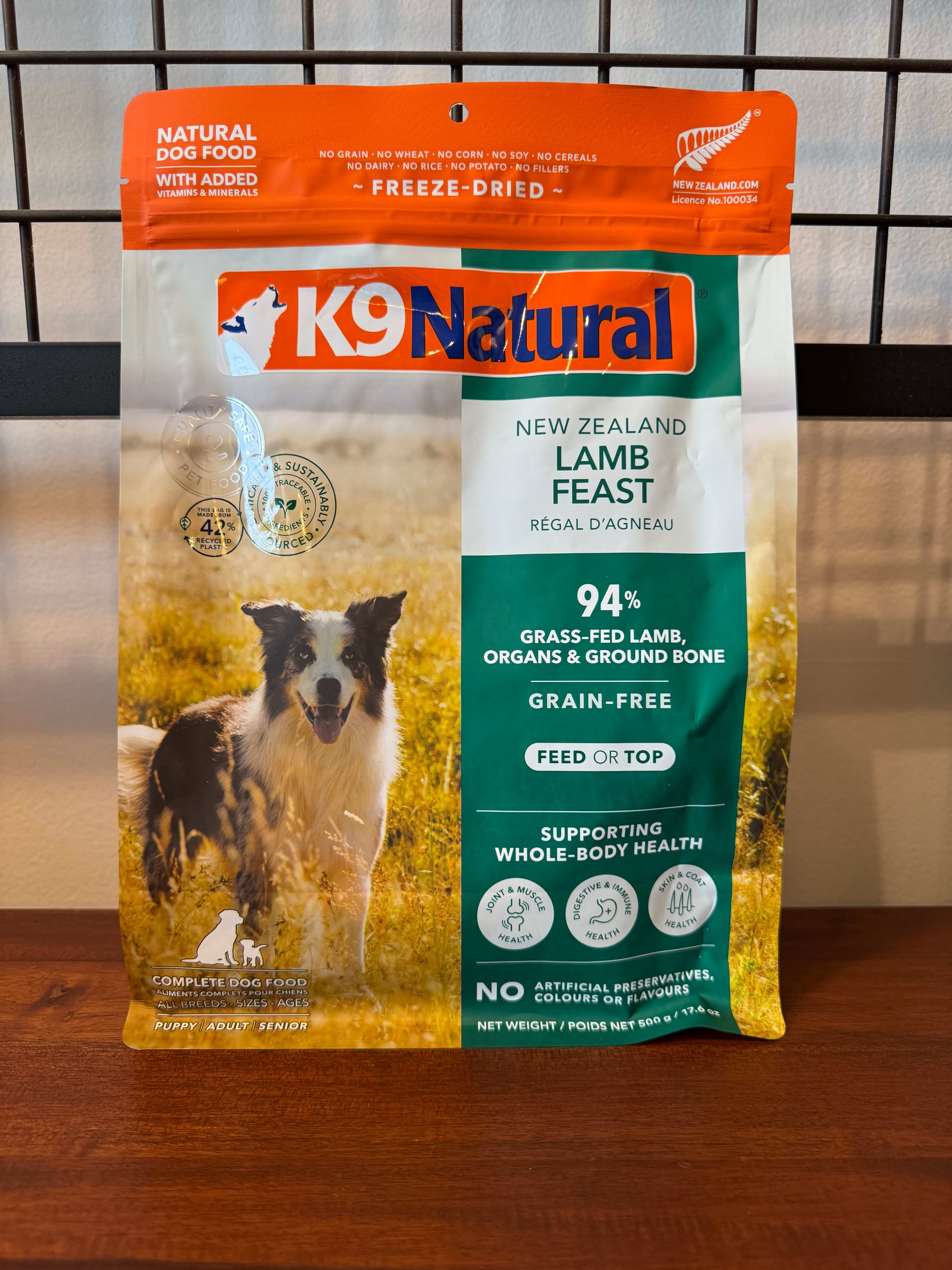 子羊肉、グリーントライプ(子羊)、心臓(子羊)、肺(子羊)、肝臓(子羊)、腎臓(子羊)、ひまわり油、フラックスシードフレーク、骨(子羊)、にんじん、ニュージーランド緑イ貝、かぼちゃ、ブロッコリー、乾燥昆布、リン酸二カリウム、ビタミンE、塩化ナトリウム、ミネラル類(プロティネイト亜鉛、プロティネイト鉄、酸化マグネシウム、セレン酵母、プロティネイト銅、プロティネイトマンガン)、ビタミン類(ビタミンB1、ベータカロチン、葉酸、ビタミンD3)
