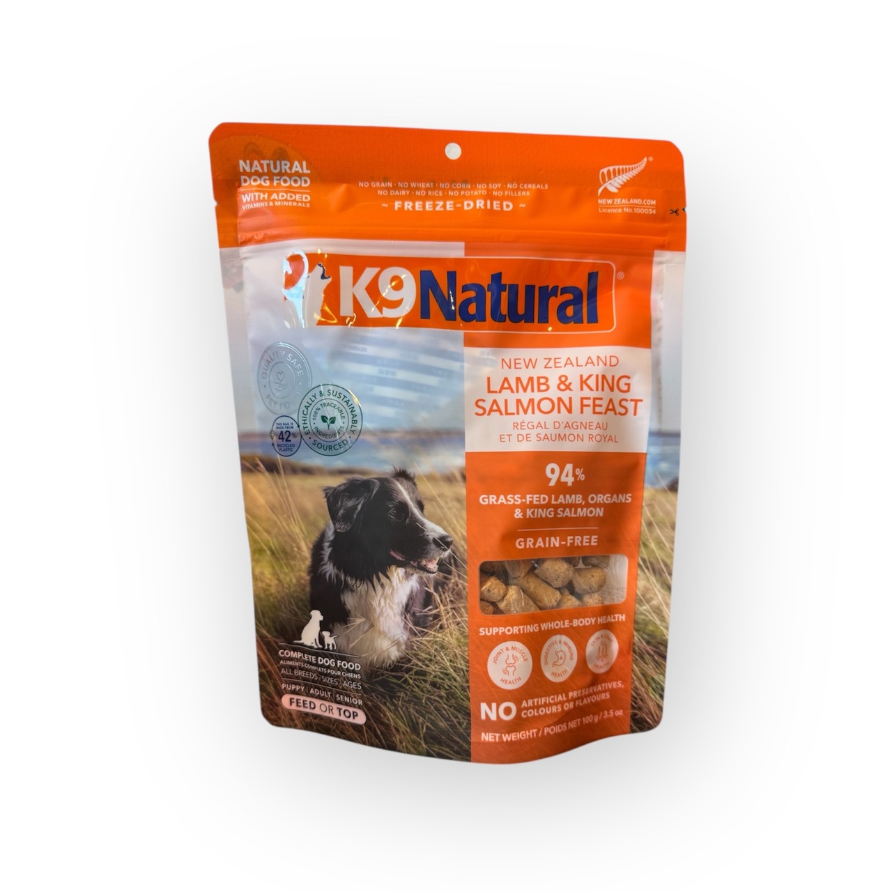 子羊肉、鮭、グリーントライプ(子羊)、肺(子羊)、肝臓(子羊)、腎臓(子羊)、心臓(子羊)、フラックスシードフレーク、にんじん、ニュージーランド緑イ貝、骨(子羊)、かぼちゃ、ひまわり油、ブロッコリー、乾燥昆布、リン酸二カリウム、ビタミンE、塩化ナトリウム、ミネラル類(プロティネイト亜鉛、プロティネイト鉄、酸化マグネシウム、セレン酵母、プロティネイト銅、プロティネイトマンガン)、ビタミン類(ビタミンB1、ベータカロチン、葉酸、ビタミンD3)