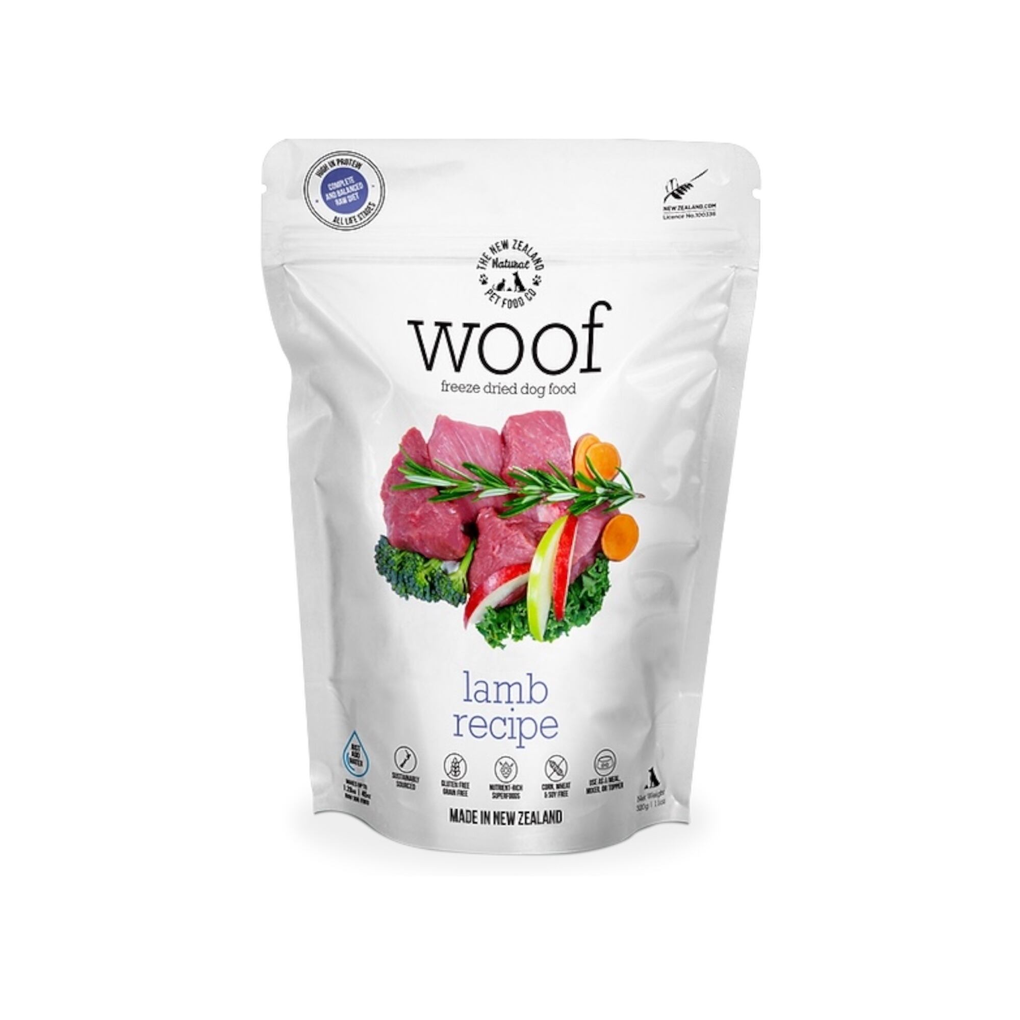 ラム、ラムグリーントライプ、ラムハート、ラムレバー、ラムキドニー、ラム骨、ブロッコリー、ニンジン、リンゴ、ケール、ケルプ、NZ緑イ貝、NZマヌカハニー、ローズマリー、オーガニックバージンココナッツオイル、ホキ油、ビタミンD3、塩、塩化コリン、亜鉛アミノ酸複合体、鉄アミノ酸複合体、ビタミンE、銅アミノ酸複合体、マンガンアミノ酸複合体、ビタミンB2、ビタミンB1