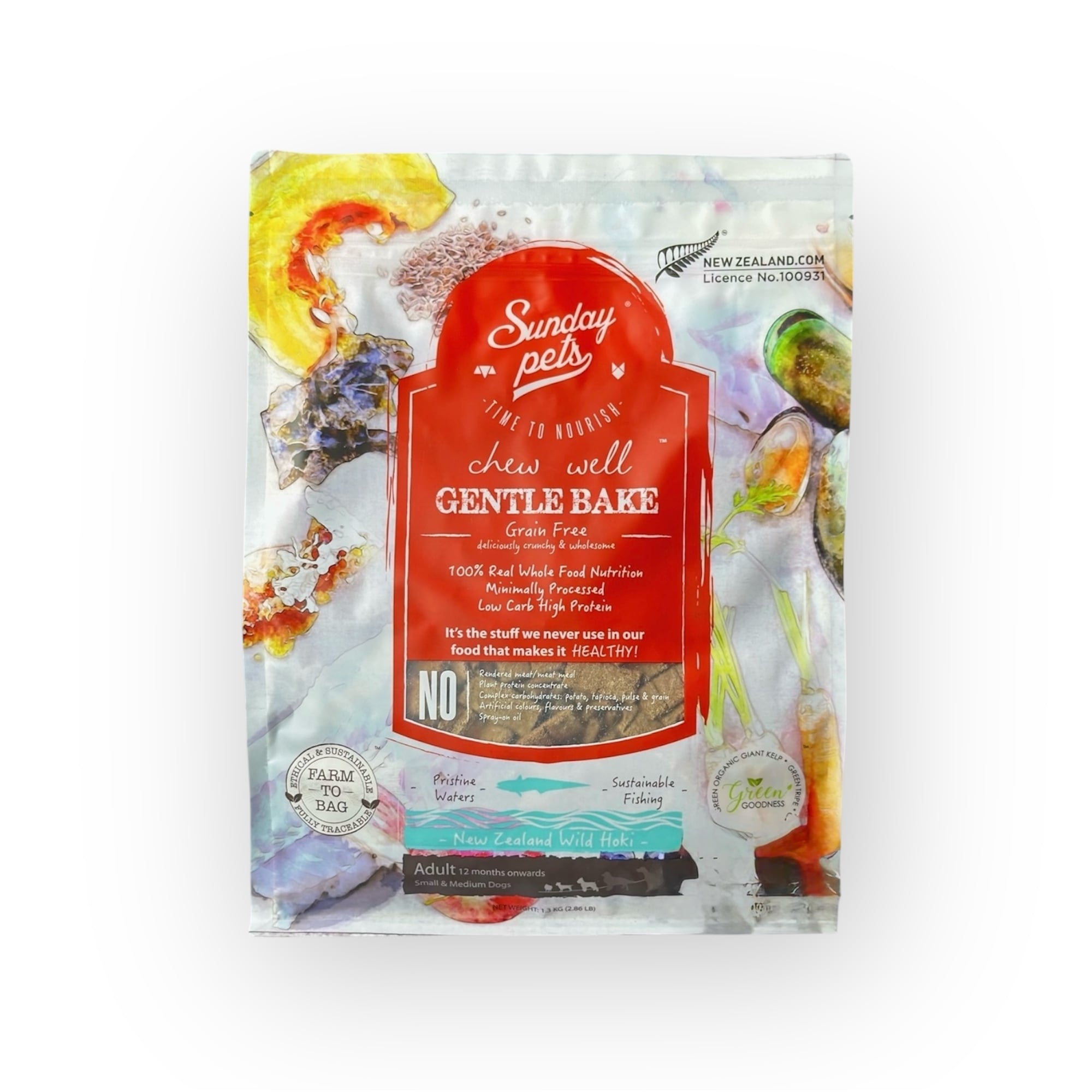 サンデーペッツ自慢のGentle Bake™の技法は自然の良さと味をよりよく保つため、食品全体の成分から水分をやさしく取り除きます。風味や栄養を損失しないよう人工的なもの(フレーバー強化スプレー・オイルスプレー等)は使用しておりません。