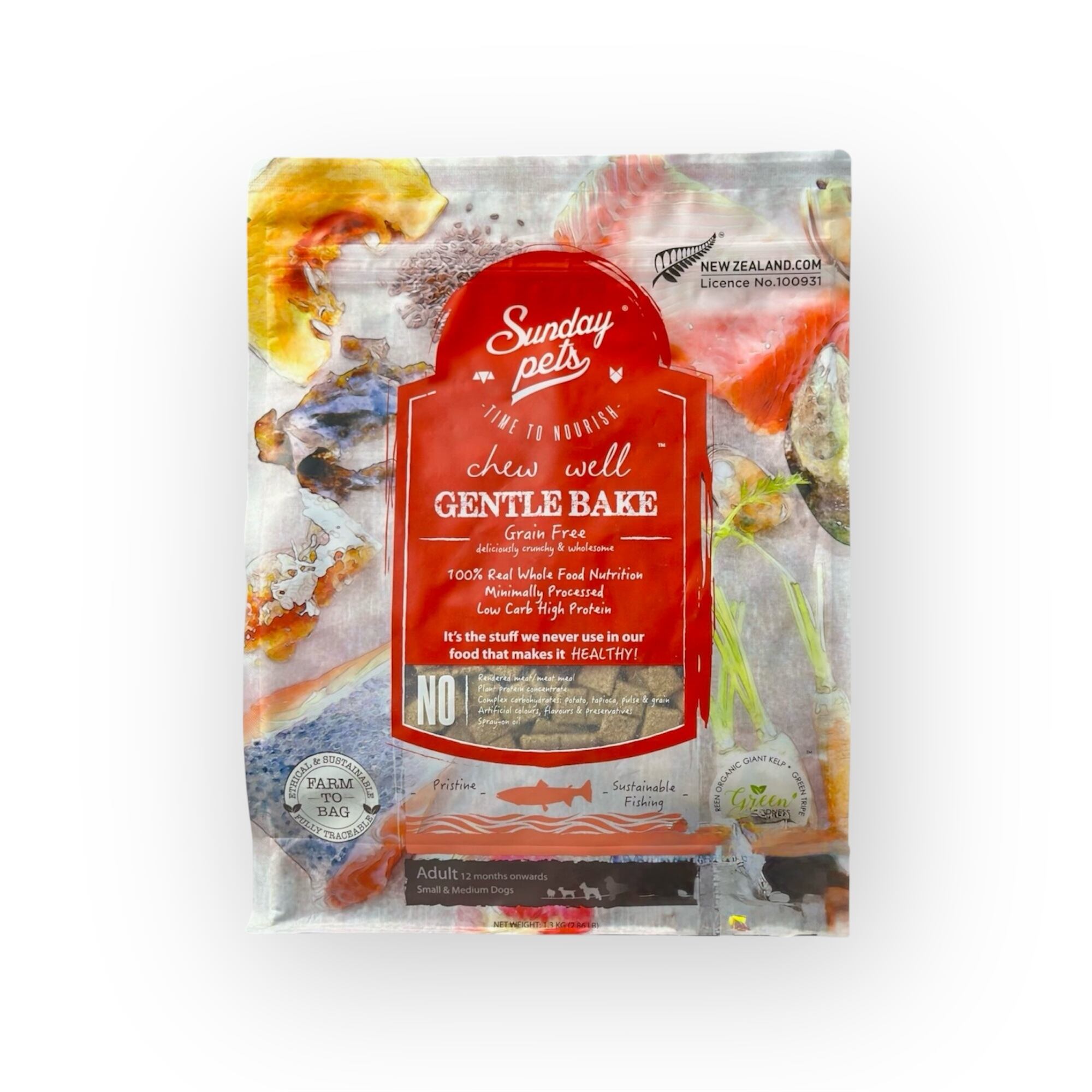 サンデーペッツ自慢のGentle Bake™の技法は自然の良さと味をよりよく保つため、食品全体の成分から水分をやさしく取り除きます。風味や栄養を損失しないよう人工的なもの(フレーバー強化スプレー・オイルスプレー等)は使用しておりません。